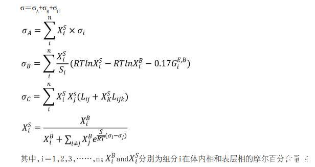 在一些實施方式中,基于表面張力模型和最優擬合參數計算高階多元合金的表面張力包括: